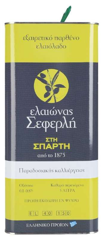 Ulei de măsline extravirgin 5L (cutie metalică)– Seferlis Estates. Presat la rece, aciditate 0,2%. Produs din soiuri grecești premium, cu gust fin și beneficii nutritive.